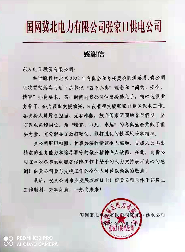 Recently, the glorious Beijing 2022 Winter Olympic Games and Paralympic Winter Games have come to a successful conclusion. During the preparation and guarantee of power supply during the Winter Olympics and the two sessions, Dongfang Electronics Corporation (hereinafter referred to as "DFE") successfully completed the task of power supply protection and won unanimous praise.