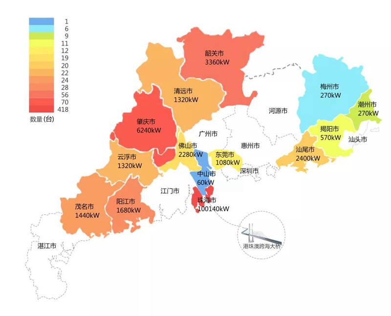 2018年,在港珠澳大桥充电桩项目中,乐鱼电子在港珠澳大桥珠海端口岸人工岛搭建的充电管理平台及电能量采集终端,为大桥的绿色运营和电力保障提供技术支持。除此之外,仅广东省内,乐鱼电子充电桩涵盖肇庆、珠海等14个城市,具体分布情况如下图所示。